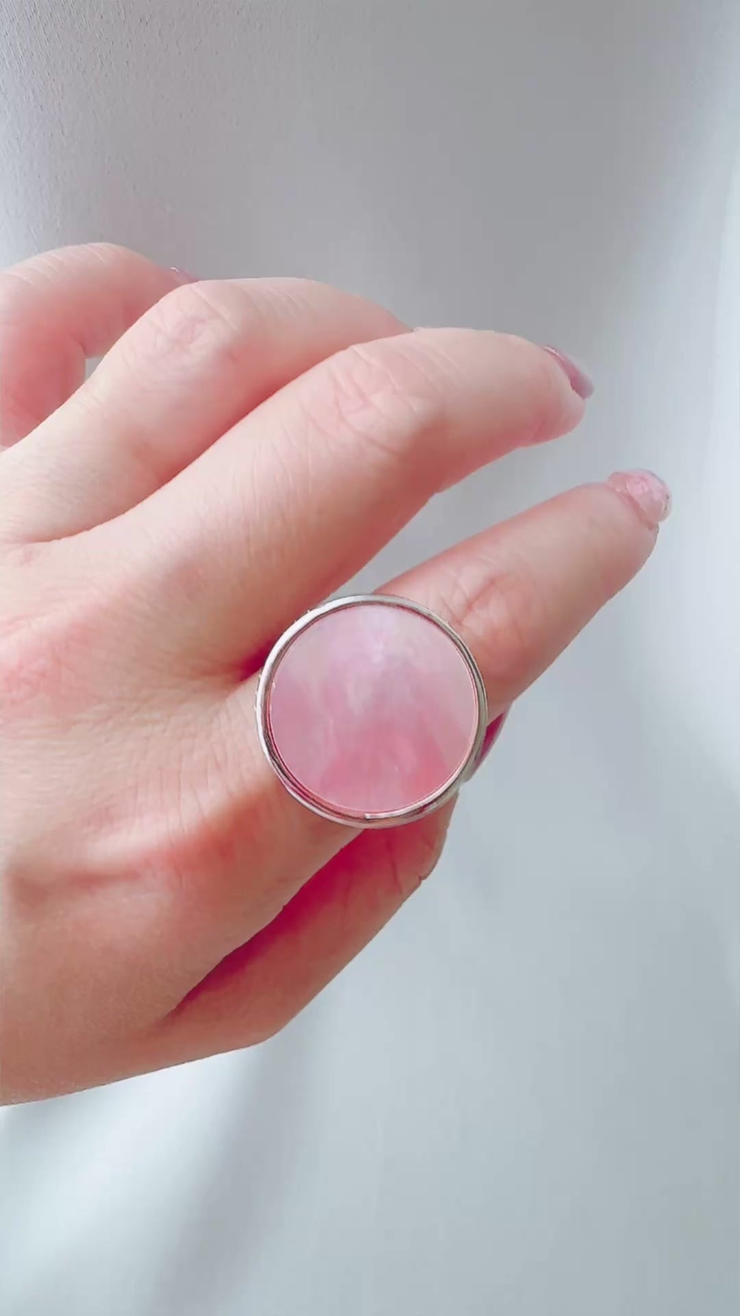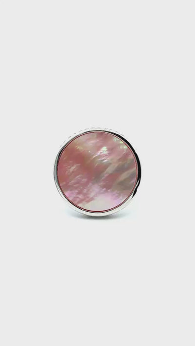 洗練された彫刻的なリング。輝くマザーオブパールのディスクが、穏やかな水面に映える月光のように、自然な虹彩を放ちます。滑らかに磨き上げられた表面と、すっきりとした円形のフレームが、ミニマルなスタイルにもフェミニンなスタイルにも自然に溶け込む、モダンで控えめな存在感を放ちます。