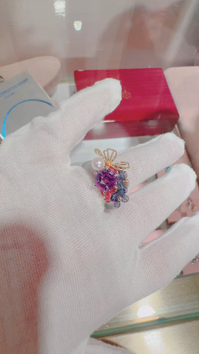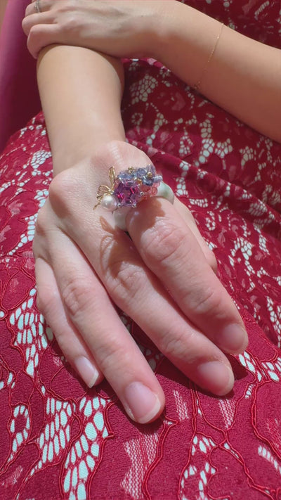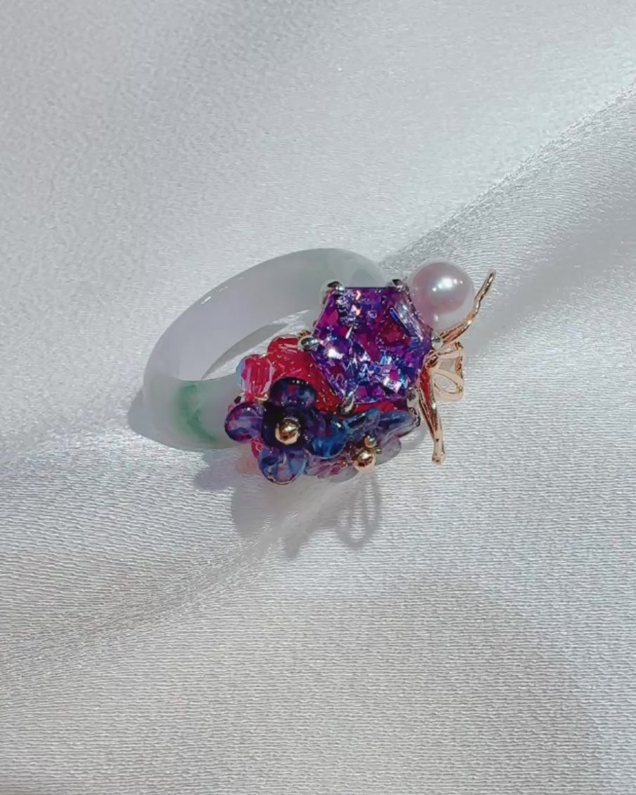 A playful yet refined statement. A translucent jade band is crowned with a vibrant cluster of faceted crystals in pink and violet tones, accented with a soft pearl and delicate floral details. Sculptural and expressive, the mix of colour, shine, and gentle curves gives this ring an artful, modern charm. Designed to stand out on its own, it adds instant personality to your look — bold, feminine, and unmistakably joyful.