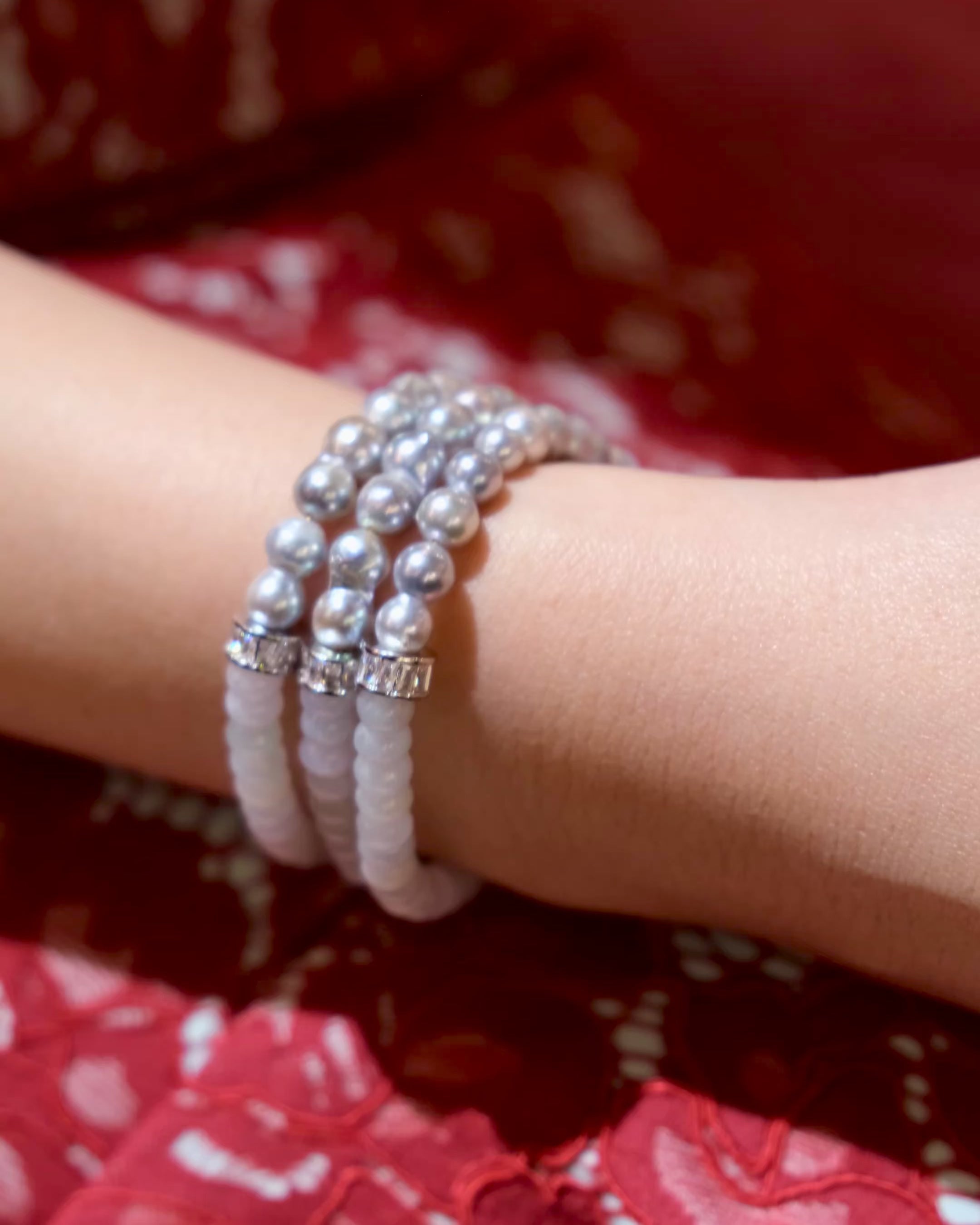 A graceful play of light and texture. Smooth, icy jadeite beads are paired with softly contoured baroque Akoya pearls, creating a double-strand bracelet that feels calm, luminous, and quietly luxurious. The natural curves of the pearls add character and depth, while the jadeite brings a cool, polished balance. Finished with a refined pavé clasp, this piece slips effortlessly from day to evening — elegant on its own, beautiful layered, and endlessly wearable. The kind of bracelet that makes even the simplest outfit feel intentional.
