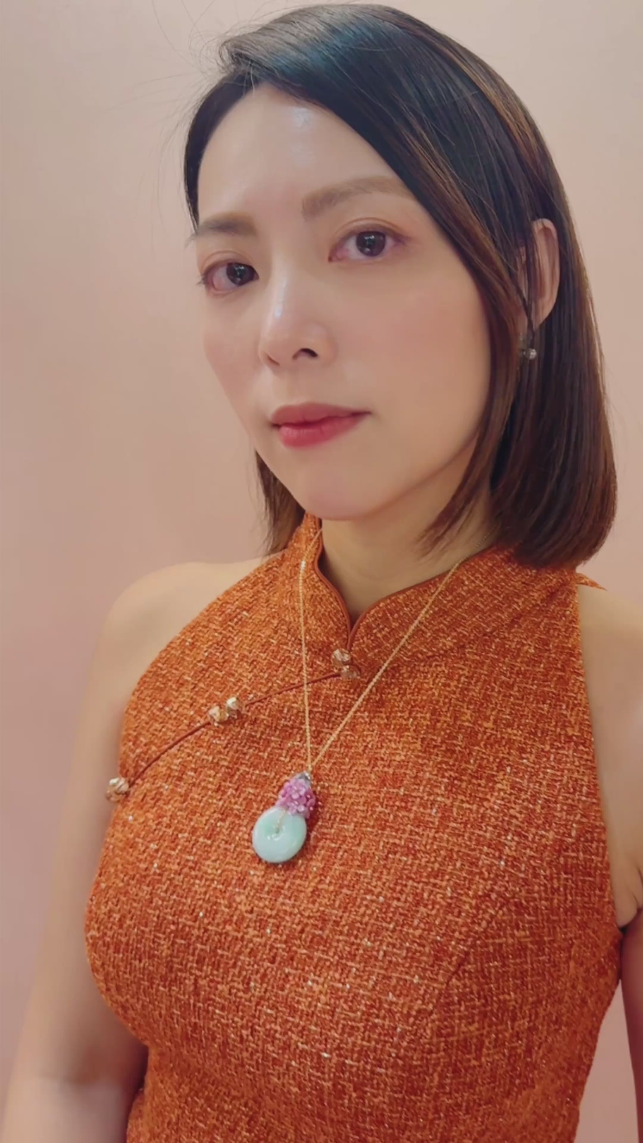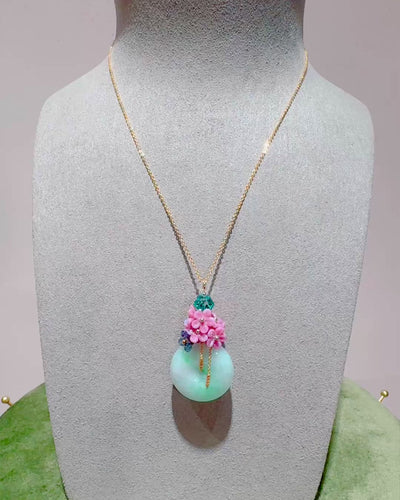 A luminous jadeite disc anchors this necklace with calm, polished presence, suspended from a fine gold chain for an elegant, elongated line. Above it, a cluster of delicate pink floral details brings softness and contrast, adding a gentle pop of colour without overwhelming the design. Refined yet expressive, this piece feels quietly special — the kind of necklace that draws the eye, flatters the neckline, and elevates even the simplest outfit with ease.
