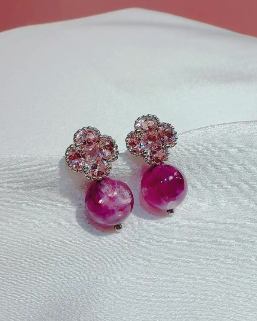 Soft blush crystals set in a refined floral cluster, paired with vivid pink gemstone drops that glow against the skin. The contrast is fresh and flattering — sparkling at the top, smooth and luminous below.