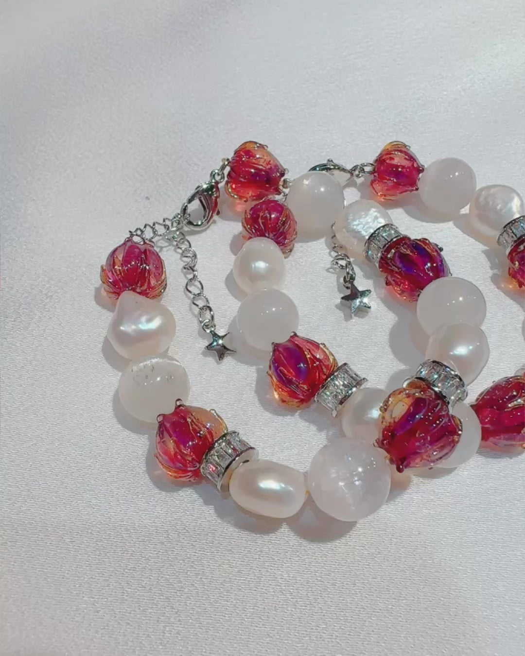 Soft, luminous moonstone beads glow with a gentle inner light, paired with creamy freshwater pearls for a clean, elegant balance. Hand-blown glass flowers add a playful, artistic touch — each one slightly different, catching light in warm pink and coral tones. Finished with delicate crystal accents and a subtle charm, this bracelet feels whimsical yet refined. Easy to wear, quietly eye-catching, and perfect for adding a touch of romance to everyday looks or special moments alike.