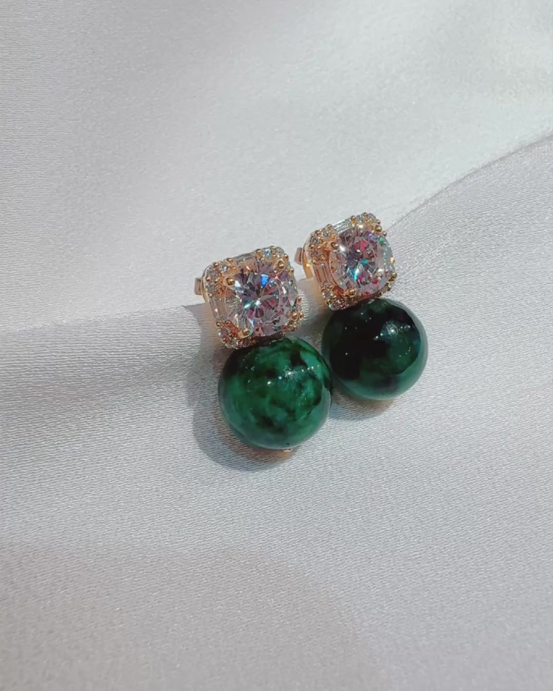 Deep green jadeite drops with natural marbling are paired with crisp, diamond-cut square tops that catch the light from every angle. The mix feels confident and polished — rich colour below, clean brilliance above. Striking yet wearable, these bring structure, glow, and quiet luxury to both day and evening looks.
