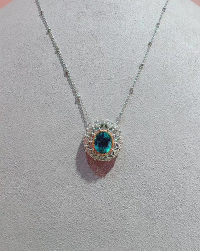 This exquisite pendant showcases a ornate silver lace setting. Radiating vintage charm and regal elegance, it's a true statement of timeless sophistication.