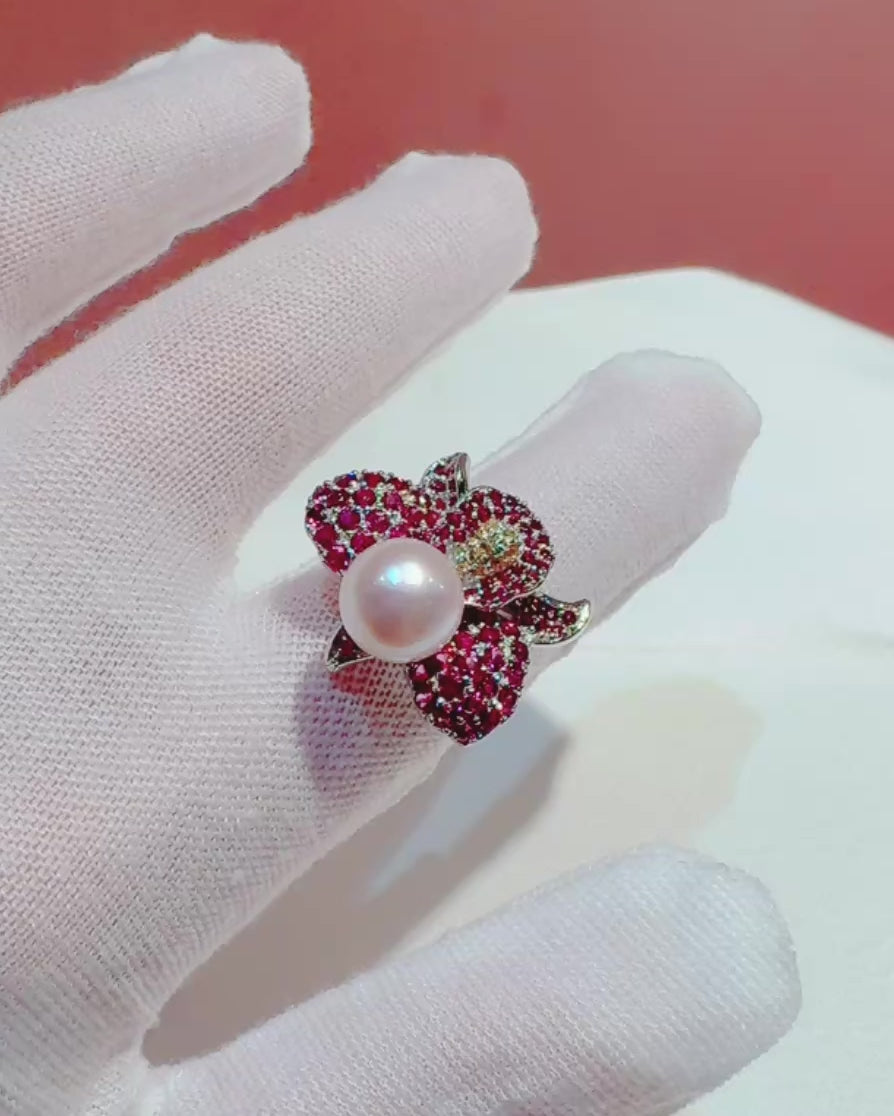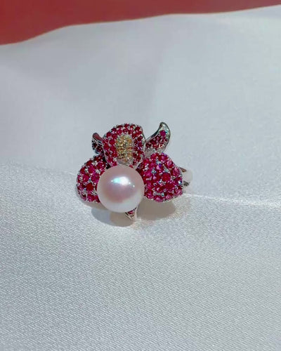 A bold floral ring centred on a 9mm luxury Akoya pearl, chosen for its high lustre and beautifully rounded form. Vivid pink pavé petals frame the pearl with a warm, radiant glow, creating a striking contrast between soft iridescence and confident colour. Designed to stand out on the hand, this ring adds instant presence — elegant for evenings, distinctive enough to elevate everyday styling.