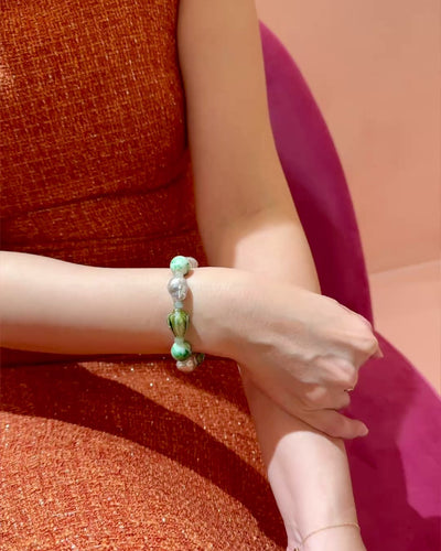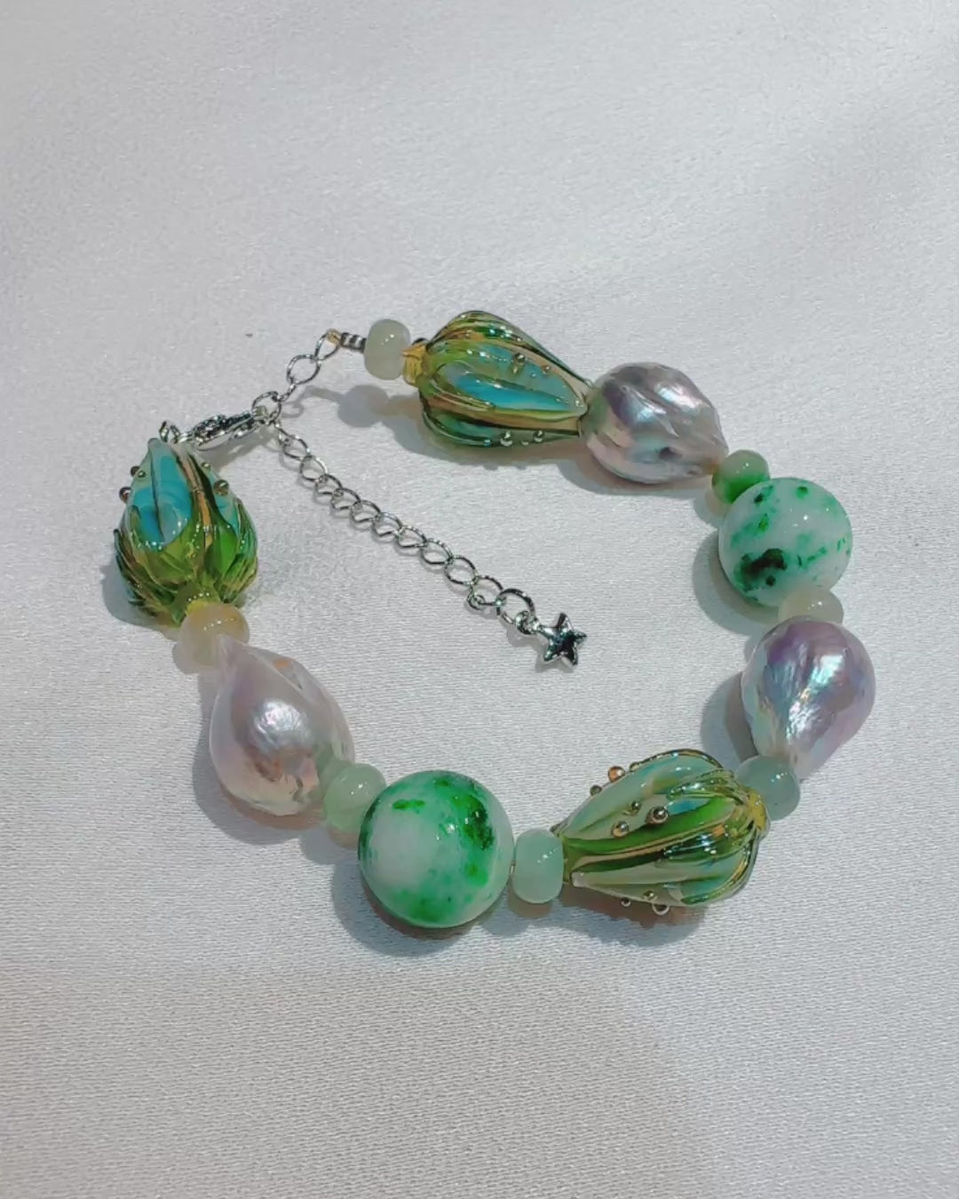 A fresh, expressive composition inspired by light, water, and movement. Hand-blown glass beads in layered shades of jade, sea-green, and soft blue anchor the design, each one sculptural and slightly different. They are balanced with luminous freshwater pearls and translucent green stone beads that add clarity and rhythm to the piece. Finished with a delicate charm detail, this bracelet feels playful yet composed — a standout accent that brings colour, texture, and an artful edge to everyday styling.